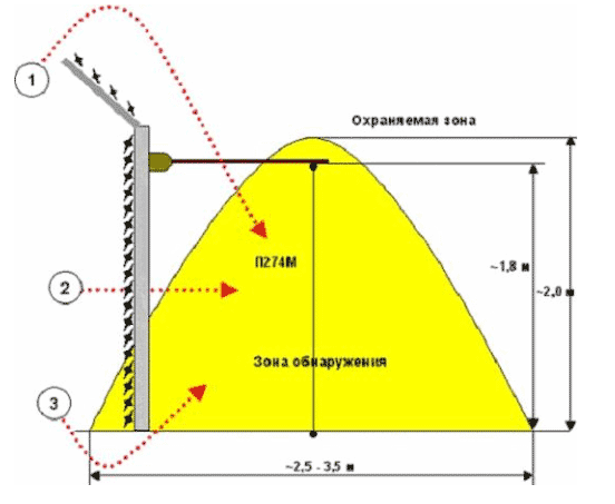 Объемная чувствительная зона обнаружения (полуэллипс вращения) имеет ширину у поверхности земли 2,5-3,5 м и высоту 2 м.