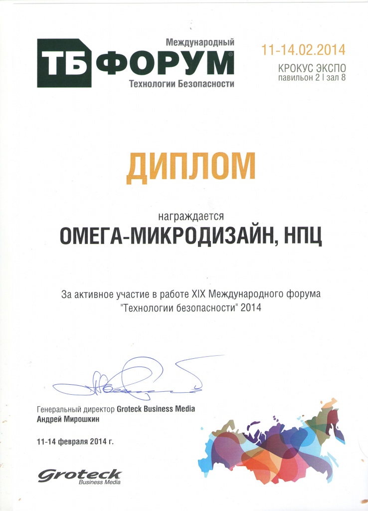 Наш предприятие выражает большую благодарность коллективу Компании «Гротек» за профессиональный подход к организации Форума ТБ 2014, за возможность участия в широких форматах мероприятий в рамках выставки: профессиональные пленарные заседания, дискуссии, круглые столы и семинары и конференции по различным направлениям в сфере безопасности.