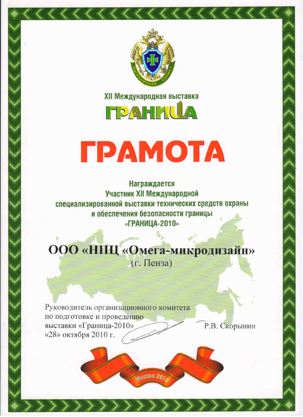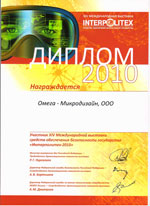 | Наше предприятие ежегодно участвует в выставке INTERPOLITEX, за прошедшие годы много раз отмечено дипломами и медалями конкурсов. В этом году НПЦ «Омега-микродизайн» награжден дипломом, а в рамках Специализированной выставки технических средств охраны и обеспечения безопасности границы «ГРАНИЦА», которая является частью Форума INTERPOLITEX, мы отмечены почетной грамотой «Специализированной выставки технических средств охраны и обеспечения безопасности границы «ГРАНИЦА-2010». На протяжении 20 лет наш Центр занимается разработкой, производством и дальнейшим совершенствованием радиоволновых и проводноволновых извещателей для охраны периметров и границ территорий. Нашей главной |