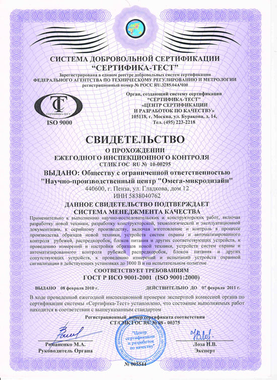 Настоящий сертификат удостоверяет СИСТЕМУ МЕНЕДЖМЕНТА КАЧЕСТВА НПЦ «ОМЕГА-МИКРОДИЗАЙН», применительно к выполнению научно-исследовательских и конструкторских работ, включая разработку новой техники, разработку конструкторской, технологической и эксплуатационной документации к серийному производству, включая изготовление и контроль в процессе производства образцов новой техники, устройств систем охраны и автоматизированного контроля рубежей, распредкоробок, блоков питания и других соответствующих устройств к проведению измерений и настройки образцов новой техники, устройств систем охраны и автоматизированного контроля рубежей, распредкоробок, блоков питания и других сопутствующих устройств, к проведению измерений и испытаний устройств охранной сигнализации в действующих установках до 1000 В и на испытательном полигоне.