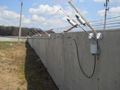 Проводноволновой извещатель Импульс-мини-1/500 стоит на охране водозаборных участков, принадлежащих компании «Балтика». Участок огорожен железобетонным забором с АКЛ по периметру. Периметр расположен на холмистой местности, и ограждение имеет перепады высот в пролетах (как видно на фото).
