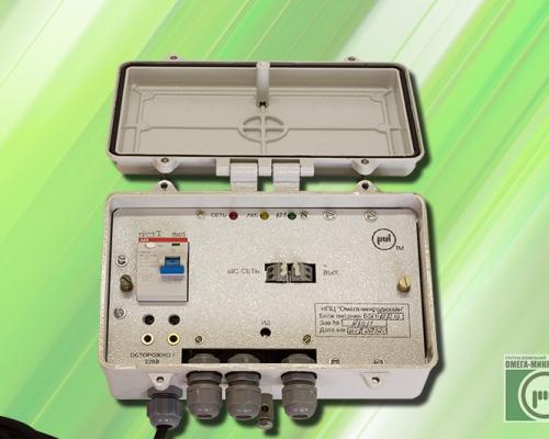 Внутри корпуса установлена сменная аккумуляторная батарея номинальным напряжением 12 В и емкостью 1,2 А/ч, обеспечивающая бесперебойное питание подключенных устройств при кратковременных отключениях сетевого напряжения ~220.